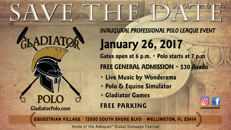 Wellington, FL – January 22, 2017 -Mark Bellissimo and the International Polo Club (IPC) announced today the formation of an exhilarating sports initiative, highlighting the tenacity and speed of polo in an engaging and spectator-fueled atmosphere at the Equestrian Village (EV) of Palm Beach International Equestrian Center (PBIEC) centrally located at the corner of Pierson and South Shore Blvd. The Gladiator Polotminaugural arena polo event, sanctioned by the United States Polo Association (USPA), is set to take place on Thursday, January 26, with gates opening at 6:00 p.m. Free general admission for spectators will include a number of family-friendly activities including chariot racing, gladiator jousting, spectator skill challenges as well as Wellington’s favorite band Wonderama. An authentic Argentinian Asado (BBQ) will be available for a fee of $30 per person and can be reserved online at http://bit.ly/2jOWRVG. It will be hosted at the VIP pavilion overlooking the arena.